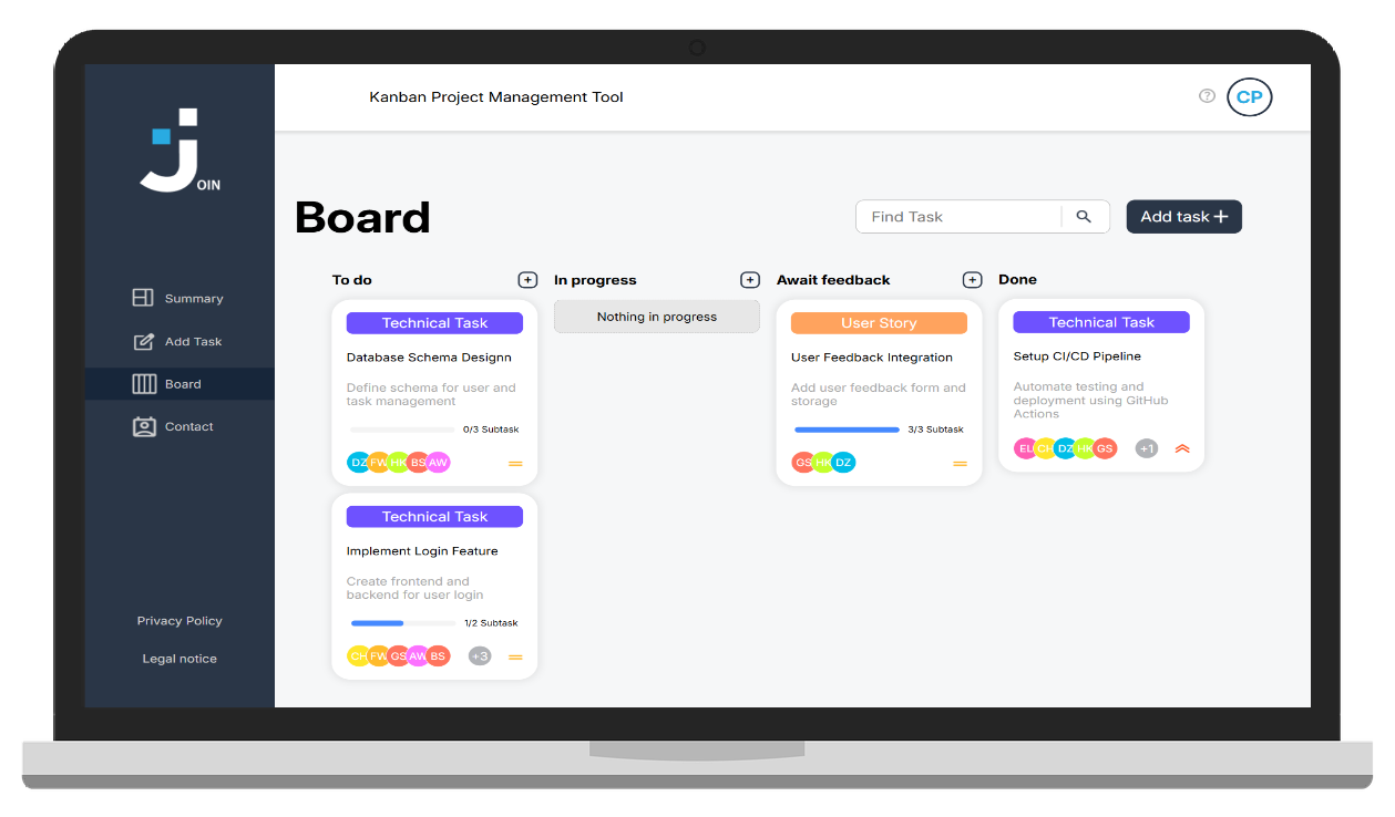 Task manager inspired by the Kanban System. Create and organize tasks using drag and drop functions, assign users and categories.
